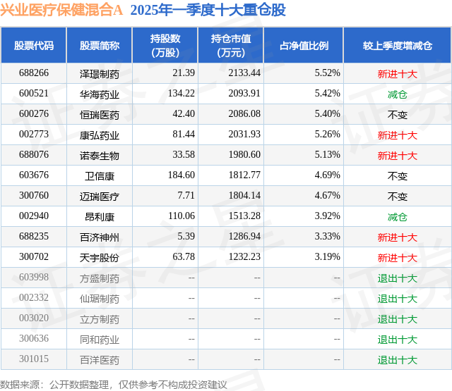 兴业医疗保健混合A的前十大重仓股如下: