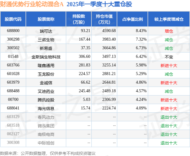 财通优势行业轮动混合A的前十大重仓股如下: