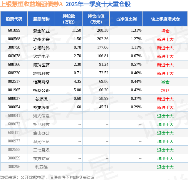 上银慧恒收益增强债券A的前十大重仓股如下: