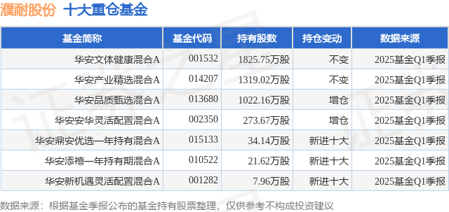 根据2025基金Q1季报公募基金重仓股数据,重仓该股的公募基金共7家,其中持有数量最多的公募基金为华安基金的华安文体健康混合A。华安文体健康混合A目前规模为21.11亿元,最新净值3.393(7月4日),较上一交易日上涨0.41%,近一年上涨30.35%。该公募基金现任基金经理为刘畅畅 桑翔宇。刘畅畅在任的基金产品包括:华安安华灵活配置混合A,管理时间为2021年8月10日至今,期间收益率为6.45%;华安产业精选混合A,管理时间为2021年12月29日至今,期间收益率为-5.16%;华安品质甄选混合A,管理时间为2022年7月21日至今,期间收益率为-3.66%。桑翔宇在任的基金产品包括:华安医药生物股票发起式A,管理时间为2024年12月25日至今,期间收益率为80.73%;华安汇宏精选混合A,管理时间为2025年5月6日至今,期间收益率为24.02%。