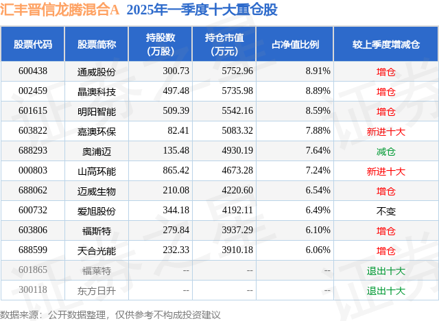 根据2025基金Q1季报公募基金重仓股数据,重仓该股的公募基金共4家,其中持有数量最多的公募基金为汇丰晋信基金的汇丰晋信龙腾混合A。汇丰晋信龙腾混合A目前规模为5.56亿元,最新净值1.0807(7月4日),较上一交易日下跌0.8%,近一年上涨22.56%。该公募基金现任基金经理为陆彬。陆彬在任的基金产品包括:汇丰晋信智造先锋股票A,管理时间为2019年5月18日至今,期间收益率为135.24%;汇丰晋信低碳先锋股票A,管理时间为2019年8月17日至今,期间收益率为120.67%;汇丰晋信动态策略混合A,管理时间为2020年5月9日至今,期间收益率为57.05%;汇丰晋信核心成长A,管理时间为2021年5月24日至今,期间收益率为-23.64%。