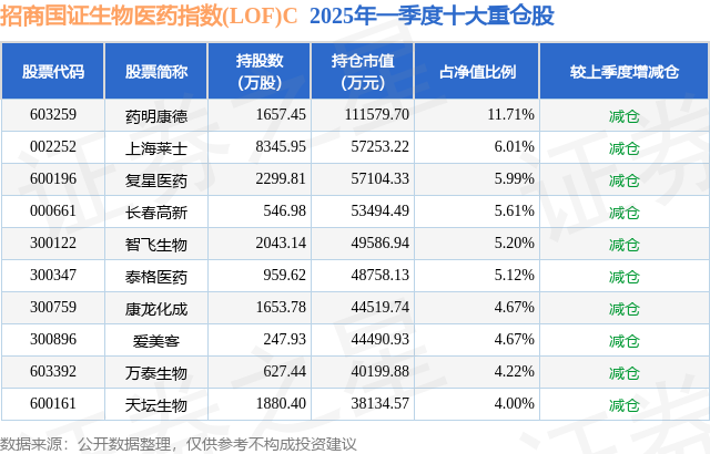 招商国证生物医药指数(LOF)C的前十大重仓股如下: