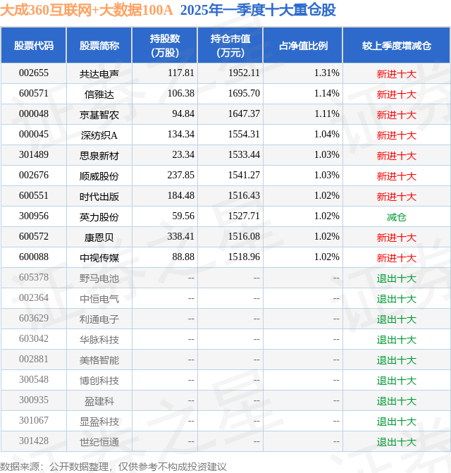 根据2025基金Q1季报公募基金重仓股数据,重仓该股的公募基金共1家,其中持有数量最多的公募基金为大成基金的大成360互联网+大数据100A。大成360互联网+大数据100A目前规模为6.95亿元,最新净值2.7619(7月7日),较上一交易日上涨0.32%,近一年上涨62.52%。该公募基金现任基金经理为夏高。夏高在任的基金产品包括:大成沪深300增强发起式A,管理时间为2021年2月23日至今,期间收益率为-13.4%;大成动态量化配置策略混合A,管理时间为2023年4月14日至今,期间收益率为-6.09%;大成中证500指数增强A,管理时间为2024年7月19日至今,期间收益率为22.79%。