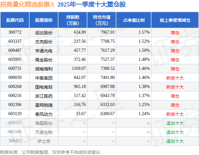 根据2025基金Q1季报公募基金重仓股数据,重仓该股的公募基金共11家,其中持有数量最多的公募基金为招商基金的招商量化精选股票A。招商量化精选股票A目前规模为26.94亿元,最新净值2.9377(7月7日),较上一交易日上涨0.42%,近一年上涨40.84%。该公募基金现任基金经理为王平。王平在任的基金产品包括:招商沪深300指数增强A,管理时间为2017年2月10日至今,期间收益率为58.8%;招商中证红利ETF,管理时间为2019年11月28日至今,期间收益率为98.89%;招商中证光伏产业指数A,管理时间为2021年6月18日至今,期间收益率为-51.45%。