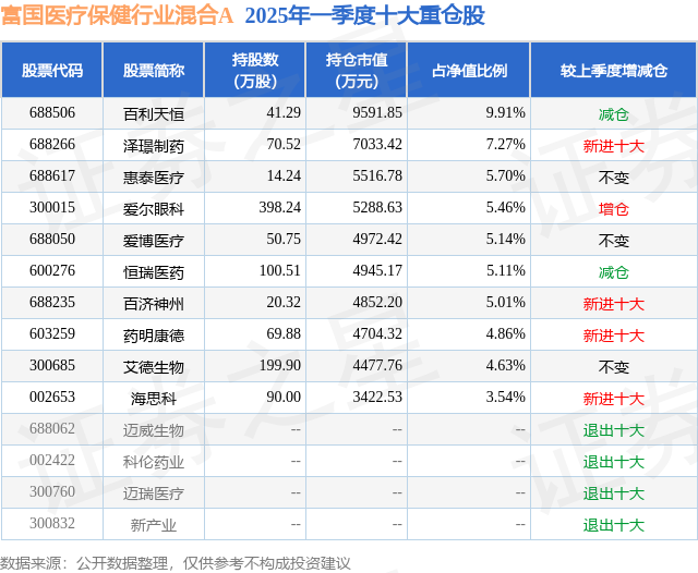 富国医疗保健行业混合A的前十大重仓股如下: