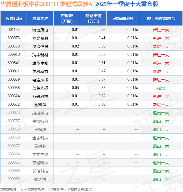 根据2025基金Q1季报公募基金重仓股数据,重仓该股的公募基金共1家,其中持有数量最多的公募基金为华夏基金的华夏创业板中盘200ETF发起式联接A。华夏创业板中盘200ETF发起式联接A目前规模为0.27亿元,最新净值1.3012(7月7日),较上一交易日上涨0.3%,近一年上涨51.48%。该公募基金现任基金经理为华龙。华龙在任的基金产品包括:华夏饲料豆粕期货ETF联接A,管理时间为2022年8月22日至今,期间收益率为13.67%;华夏上证50AH优选指数A,管理时间为2022年8月22日至今,期间收益率为13.2%;华夏中证机器人ETF发起式联接A,管理时间为2023年5月31日至今,期间收益率为1.56%;华夏消费电子ETF联接A,管理时间为2023年6月2日至今,期间收益率为20.83%。