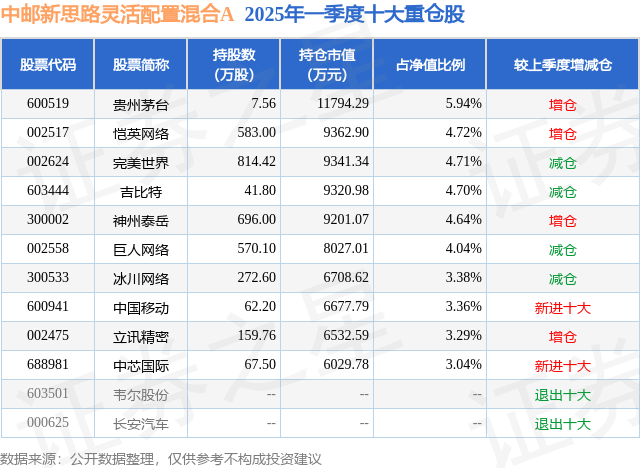 根据2025基金Q1季报公募基金重仓股数据,重仓该股的公募基金共12家,其中持有数量最多的公募基金为中邮基金的中邮新思路灵活配置混合A。中邮新思路灵活配置混合A目前规模为19.77亿元,最新净值2.559(7月7日),较上一交易日下跌0.47%,近一年上涨17.49%。该公募基金现任基金经理为金振振。金振振在任的基金产品包括:中邮未来成长混合A,管理时间为2022年8月22日至今,期间收益率为44.97%;