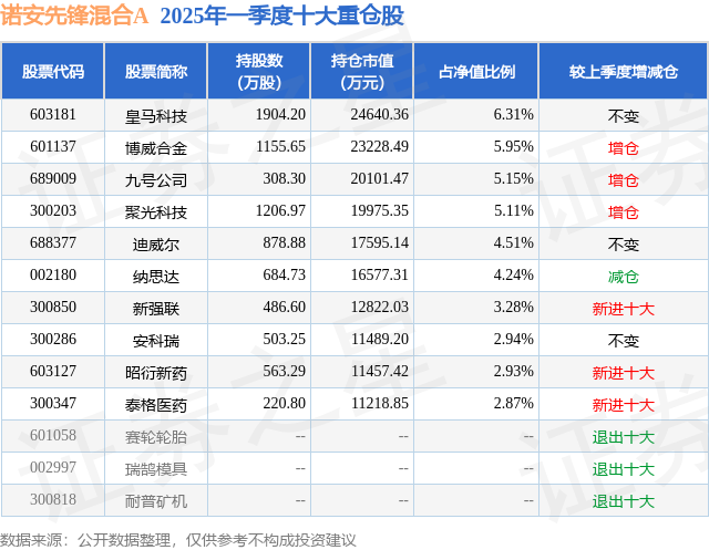 诺安先锋混合A的前十大重仓股如下: