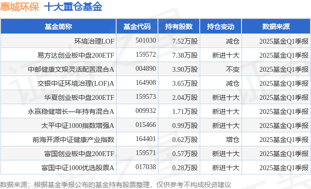 重仓惠城环保的前十大公募基金请见下表:
