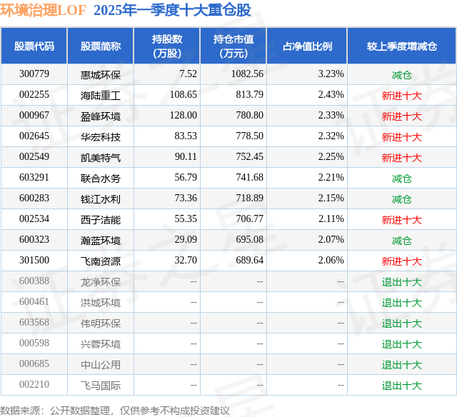环境治理LOF的前十大重仓股如下:
