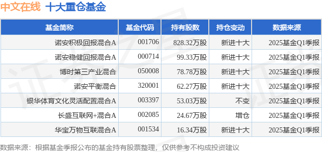 根据2025基金Q1季报公募基金重仓股数据,重仓该股的公募基金共7家,其中持有数量最多的公募基金为诺安基金的诺安积极回报混合A。诺安积极回报混合A目前规模为15.77亿元,最新净值1.91(7月8日),较上一交易日上涨1.54%,近一年上涨9.21%。该公募基金现任基金经理为刘慧影。刘慧影在任的基金产品包括:诺安优化配置混合A,管理时间为2022年8月3日至今,期间收益率为19.5%;诺安成长混合,管理时间为2023年2月18日至今,期间收益率为4.15%;