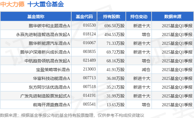 根据2025基金Q1季报公募基金重仓股数据,重仓该股的公募基金共19家,其中持有数量最多的公募基金为鹏华基金的鹏华碳中和主题混合A。鹏华碳中和主题混合A目前规模为25.61亿元,最新净值1.4082(7月8日),较上一交易日上涨1.32%,近一年上涨110.59%。该公募基金现任基金经理为闫思倩。闫思倩在任的基金产品包括:鹏华沪深港新兴成长混合A,管理时间为2022年5月7日至今,期间收益率为13.95%;鹏华新能源汽车混合A,管理时间为2022年7月26日至今,期间收益率为-20.16%;鹏华科技驱动混合发起式A,管理时间为2024年8月29日至今,期间收益率为17.44%。