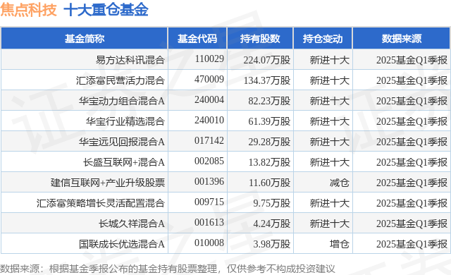 根据2025基金Q1季报公募基金重仓股数据,重仓该股的公募基金共11家,其中持有数量最多的公募基金为易方达基金的易方达科讯混合。易方达科讯混合目前规模为37.2亿元,最新净值1.7185(7月8日),较上一交易日上涨3.72%,近一年上涨30.42%。该公募基金现任基金经理为刘健维。刘健维在任的基金产品包括:易方达科融混合,管理时间为2020年6月6日至今,期间收益率为116.83%;易方达成长动力混合A,管理时间为2022年2月8日至今,期间收益率为28.38%;易方达成长进取混合A,管理时间为2025年6月19日至今,期间收益率为1.2%。