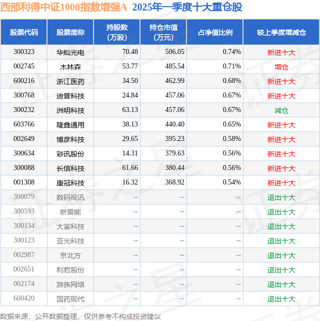 西部利得中证1000指数增强A的前十大重仓股如下: