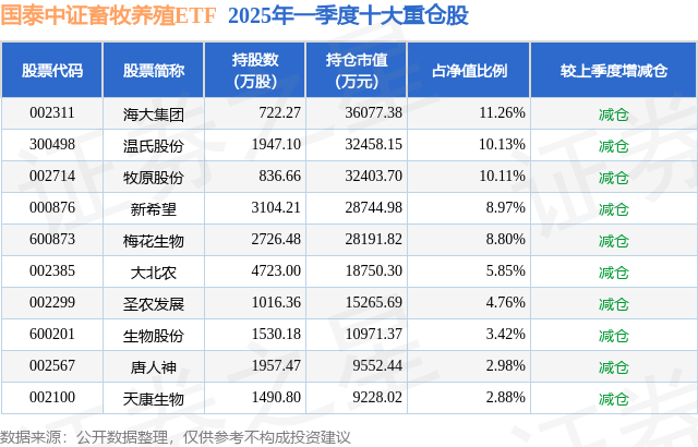 国泰中证畜牧养殖ETF的前十大重仓股如下: