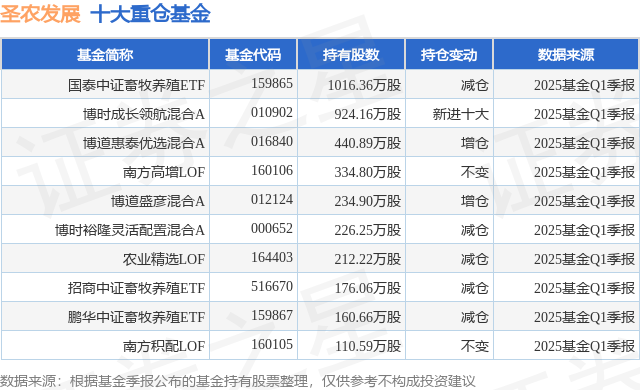 根据2025基金Q1季报公募基金重仓股数据,重仓该股的公募基金共30家,其中持有数量最多的公募基金为国泰基金的国泰中证畜牧养殖ETF。国泰中证畜牧养殖ETF目前规模为32.05亿元,最新净值0.6081(7月8日),较上一交易日上涨0.18%,近一年上涨7.12%。该公募基金现任基金经理为梁杏。梁杏在任的基金产品包括:国泰国证医药卫生行业指数A,管理时间为2016年6月8日至今,期间收益率为18.54%;国泰量化收益灵活配置混合A,管理时间为2018年7月31日至今,期间收益率为11.71%;国泰中证生物医药ETF联接A,管理时间为2019年4月16日至今,期间收益率为-1.4%;国泰中证生物医药ETF,管理时间为2019年4月18日至今,期间收益率为-3.02%。