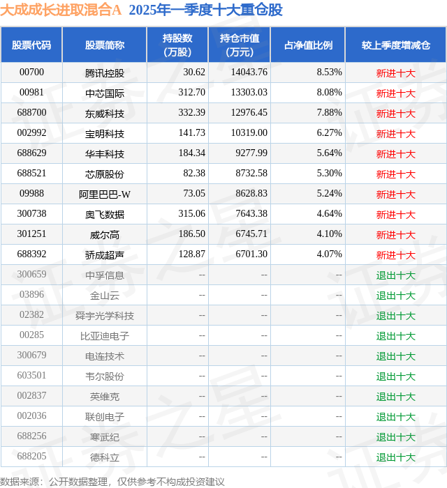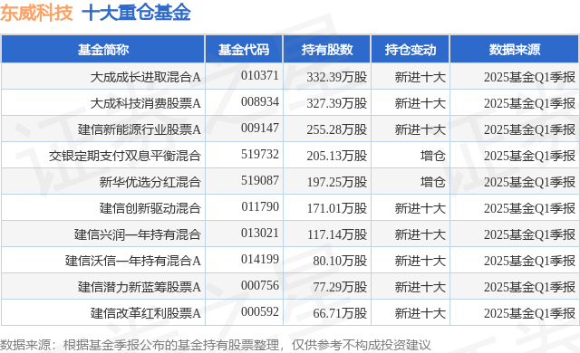 根据2025基金Q1季报公募基金重仓股数据,重仓该股的公募基金共32家,其中持有数量最多的公募基金为大成基金的大成成长进取混合A。大成成长进取混合A目前规模为5.94亿元,最新净值1.2244(7月8日),较上一交易日上涨2.64%,近一年上涨46.83%。该公募基金现任基金经理为杜聪。杜聪在任的基金产品包括:大成科技消费股票A,管理时间为2024年12月27日至今,期间收益率为7.08%;大成至臻回报混合A,管理时间为2025年6月25日至今,期间收益率为0.11%。