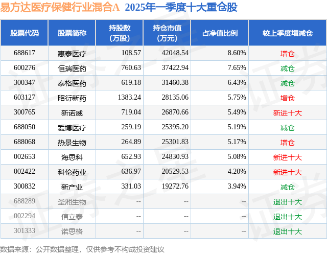 根据2025基金Q1季报公募基金重仓股数据,重仓该股的公募基金共44家,其中持有数量最多的公募基金为易方达基金的易方达医疗保健行业混合A。易方达医疗保健行业混合A目前规模为44.75亿元,最新净值3.893(7月8日),较上一交易日下跌1.77%,近一年上涨35.55%。该公募基金现任基金经理为杨桢霄。杨桢霄在任的基金产品包括:易方达全球医药行业混合发起式(QDII)A(人民币),管理时间为2020年1月20日至今,期间收益率为19.3%;易方达医药生物股票A,管理时间为2020年11月4日至今,期间收益率为-16.94%。