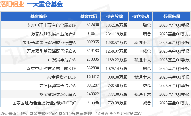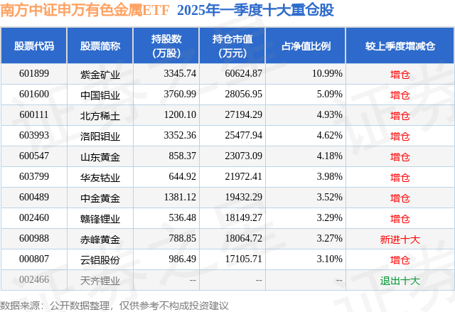 根据2025基金Q1季报公募基金重仓股数据,重仓该股的公募基金共129家,其中持有数量最多的公募基金为南方基金的南方中证申万有色金属ETF。南方中证申万有色金属ETF目前规模为55.16亿元,最新净值1.1525(7月8日),较上一交易日上涨1.06%,近一年上涨15.79%。该公募基金现任基金经理为崔蕾。崔蕾在任的基金产品包括:南方中证申万有色金属ETF发起联接A,管理时间为2019年7月12日至今,期间收益率为77.64%;南方中证1000ETF,管理时间为2019年7月12日至今,期间收益率为49.71%;南方红利低波50ETF,管理时间为2020年1月17日至今,期间收益率为97.98%。