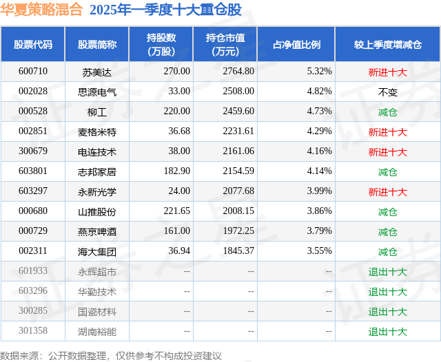 根据2025基金Q1季报公募基金重仓股数据,重仓该股的公募基金共14家,其中持有数量最多的公募基金为华夏基金的华夏策略混合。华夏策略混合目前规模为5.2亿元,最新净值4.49(7月8日),较上一交易日上涨0.45%,近一年上涨7.73%。该公募基金现任基金经理为陈伟彦。