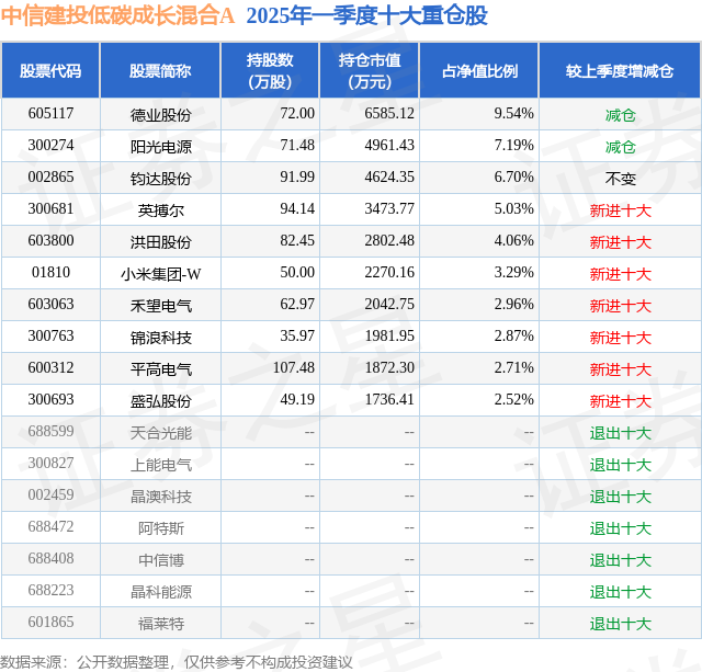 中信建投低碳成长混合A的前十大重仓股如下: