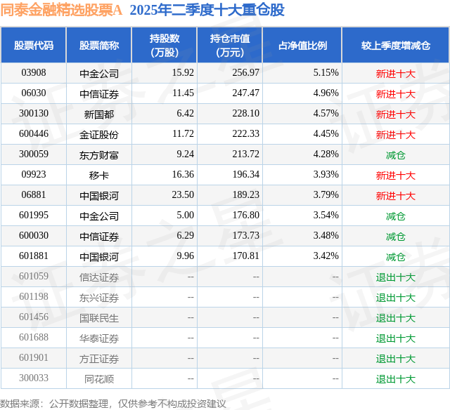 同泰金融精选股票A的前十大重仓股如下: