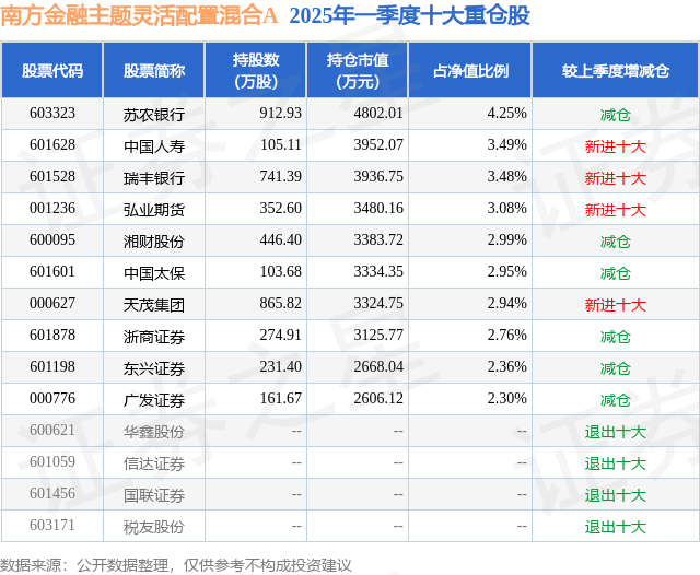 南方金融主题灵活配置混合A的前十大重仓股如下:
