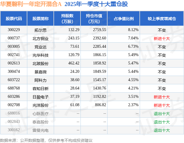 华夏磐利一年定开混合A的前十大重仓股如下: