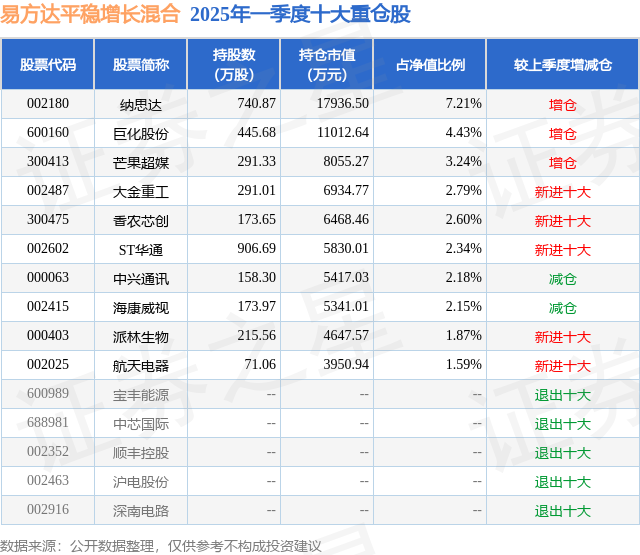 根据2025基金Q1季报公募基金重仓股数据,重仓该股的公募基金共23家,其中持有数量最多的公募基金为易方达基金的易方达平稳增长混合。易方达平稳增长混合目前规模为24.86亿元,最新净值4.707(7月9日),较上一交易日上涨0.13%,近一年上涨7.15%。该公募基金现任基金经理为陈皓。陈皓在任的基金产品包括:易方达科翔混合,管理时间为2014年5月10日至今,期间收益率为425.79%;易方达新经济混合,管理时间为2015年2月12日至今,期间收益率为254.1%;易方达均衡成长股票,管理时间为2020年5月22日至今,期间收益率为2.6%。