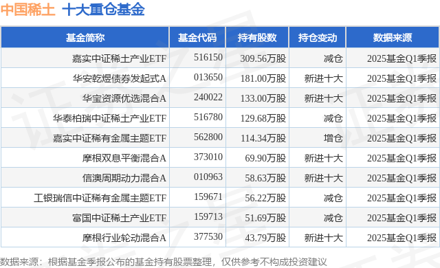 根据2025基金Q1季报公募基金重仓股数据,重仓该股的公募基金共34家,其中持有数量最多的公募基金为嘉实基金的嘉实中证稀土产业ETF。嘉实中证稀土产业ETF目前规模为17.19亿元,最新净值1.1735(7月9日),较上一交易日下跌1.48%,近一年上涨39.87%。该公募基金现任基金经理为田光远。田光远在任的基金产品包括:嘉实中证软件服务ETF,管理时间为2021年6月4日至今,期间收益率为-23.5%;嘉实中证电池主题ETF,管理时间为2021年7月13日至今,期间收益率为-48.48%;嘉实中证稀土产业ETF联接A,管理时间为2021年8月3日至今,期间收益率为-15.64%。