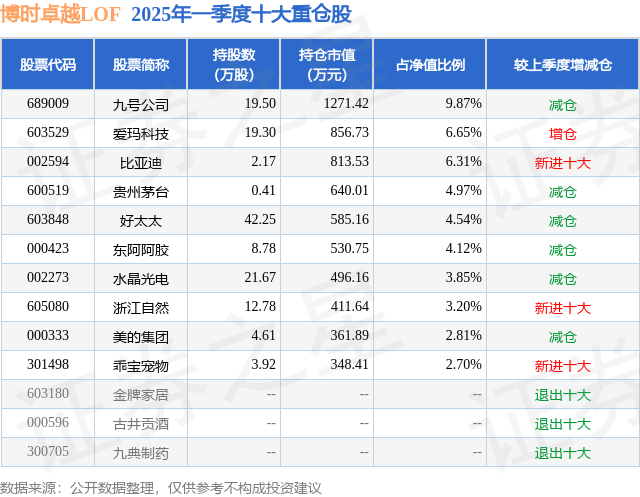 根据2025基金Q1季报公募基金重仓股数据,重仓该股的公募基金共2家,其中持有数量最多的公募基金为博时基金的博时卓越LOF。博时卓越LOF目前规模为1.29亿元,最新净值1.95(7月9日),较上一交易日上涨0.62%,近一年下跌1.86%。该公募基金现任基金经理为冀楠。冀楠在任的基金产品包括:博时精选混合A,管理时间为2021年5月18日至今,期间收益率为-42.43%;博时核心资产精选混合A,管理时间为2021年9月17日至今,期间收益率为-7.81%;博时厚泽回报混合A,管理时间为2021年11月8日至今,期间收益率为-26.72%;