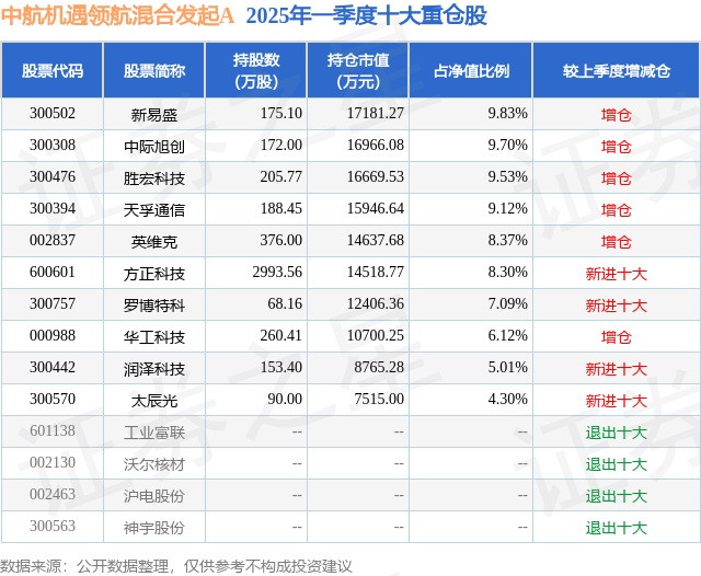 根据2025基金Q1季报公募基金重仓股数据,重仓该股的公募基金共13家,其中持有数量最多的公募基金为中航基金的中航机遇领航混合发起A。中航机遇领航混合发起A目前规模为0.98亿元,最新净值1.69(7月10日),较上一交易日上涨1.11%,近一年上涨45.93%。该公募基金现任基金经理为韩浩。韩浩在任的基金产品包括:中航军民融合精选A,管理时间为2018年2月9日至今,期间收益率为43.7%;中航新起航灵活配置混合A,管理时间为2018年4月23日至今,期间收益率为-36.46%;中航华证商飞高端制造产业指数发起A,管理时间为2023年3月7日至今,期间收益率为-6.68%;