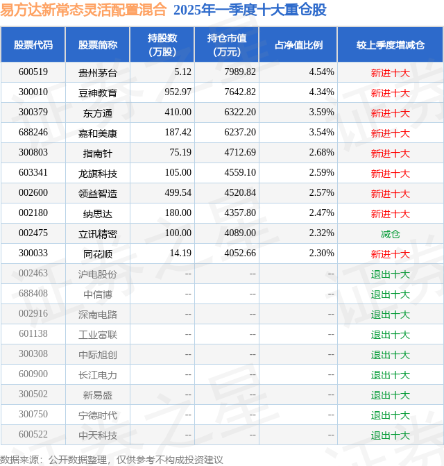 易方达新常态灵活配置混合的前十大重仓股如下: