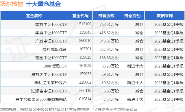 根据2025基金Q1季报公募基金重仓股数据,重仓该股的公募基金共12家,其中持有数量最多的公募基金为南方基金的南方中证1000ETF。南方中证1000ETF目前规模为514.38亿元,最新净值2.5853(7月10日),较上一交易日上涨0.26%,近一年上涨35.54%。该公募基金现任基金经理为崔蕾。崔蕾在任的基金产品包括:南方中证申万有色金属ETF发起联接A,管理时间为2019年7月12日至今,期间收益率为75.92%;南方中证申万有色金属ETF,管理时间为2019年7月12日至今,期间收益率为78.34%;南方红利低波50ETF,管理时间为2020年1月17日至今,期间收益率为98.17%。