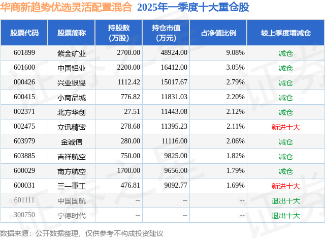 华商新趋势优选灵活配置混合的前十大重仓股如下: