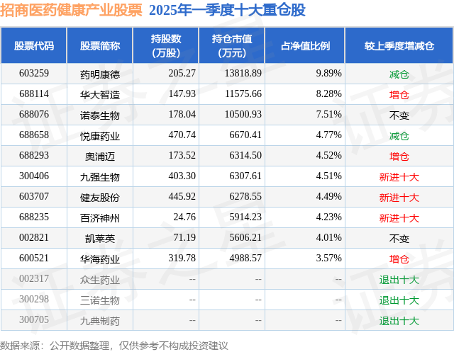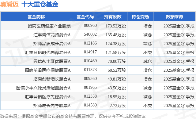 根据2025基金Q1季报公募基金重仓股数据,重仓该股的公募基金共11家,其中持有数量最多的公募基金为招商基金的招商医药健康产业股票。招商医药健康产业股票目前规模为13.98亿元,最新净值1.816(7月10日),较上一交易日上涨0.44%,近一年上涨18.85%。该公募基金现任基金经理为李佳存。李佳存在任的基金产品包括:招商创新增长混合A,管理时间为2020年6月17日至今,期间收益率为-25.11%;招商前沿医疗保健股票A,管理时间为2021年6月22日至今,期间收益率为-42.56%;招商品质成长混合A,管理时间为2021年9月23日至今,期间收益率为-27.54%。