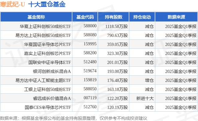 根据2025基金Q1季报公募基金重仓股数据,重仓该股的公募基金共368家,其中持有数量最多的公募基金为华夏基金的华夏上证科创板50成份ETF。华夏上证科创板50成份ETF目前规模为824.37亿元,最新净值1.0314(7月10日),较上一交易日下跌0.3%,近一年上涨38.85%。该公募基金现任基金经理为荣膺 赵宗庭。荣膺在任的基金产品包括:华夏中证500ETF联接A,管理时间为2016年10月20日至今,期间收益率为4.81%;华夏中证500ETF,管理时间为2016年10月20日至今,期间收益率为5.06%;华夏中证央企ETF,管理时间为2018年10月19日至今,期间收益率为37.14%;华夏创业板价值ETF,管理时间为2019年6月14日至今,期间收益率为42.68%。赵宗庭在任的基金产品包括:华夏沪深300ETF联接A,管理时间为2017年4月17日至今,期间收益率为33.48%;华夏沪深300ETF,管理时间为2017年4月17日至今,期间收益率为33.82%;华夏野村日经225ETF,管理时间为2019年6月12日至今,期间收益率为50.29%;华夏国证半导体芯片ETF,管理时间为2020年1月20日至今,期间收益率为19.74%。
