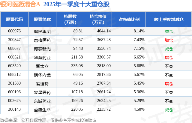 银河医药混合A的前十大重仓股如下:
