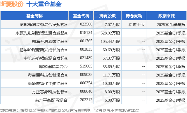 重仓斯菱股份的前十大公募基金请见下表: