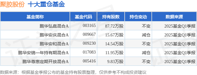根据2025基金Q1季报公募基金重仓股数据,重仓该股的公募基金共5家,其中持有数量最多的公募基金为鹏华基金的鹏华弘嘉混合A。鹏华弘嘉混合A目前规模为4.37亿元,最新净值2.5931(7月14日),较上一交易日上涨0.53%,近一年上涨43.64%。该公募基金现任基金经理为汤志彦。汤志彦在任的基金产品包括:鹏华尊惠定期开放混合A,管理时间为2018年10月27日至今,期间收益率为99.85%;鹏华安和混合A,管理时间为2020年6月17日至今,期间收益率为34.07%;鹏华安庆混合A,管理时间为2020年6月23日至今,期间收益率为36.67%。