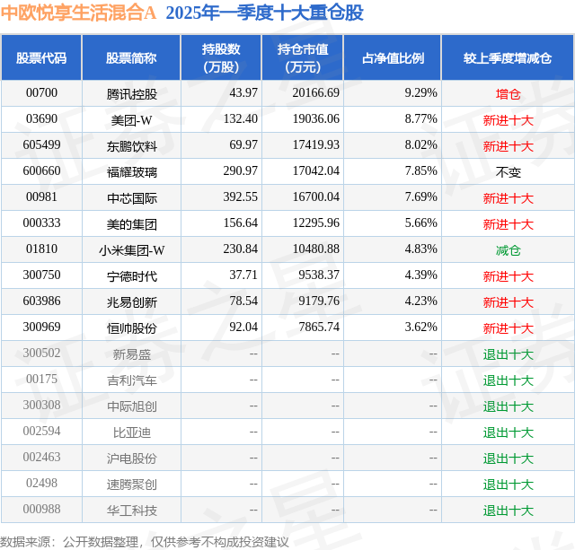 根据2025基金Q1季报公募基金重仓股数据,重仓该股的公募基金共5家,其中持有数量最多的公募基金为中欧基金的中欧悦享生活混合A。中欧悦享生活混合A目前规模为21.13亿元,最新净值0.4857(7月14日),较上一交易日下跌0.21%,近一年上涨4.14%。该公募基金现任基金经理为钱亚风云。钱亚风云在任的基金产品包括:中欧行业景气一年持有混合A,管理时间为2022年11月2日至今,期间收益率为-12.34%;中欧聚优港股通混合发起A,管理时间为2023年4月11日至今,期间收益率为10.77%;中欧致和混合A,管理时间为2023年5月23日至今,期间收益率为-5.96%。