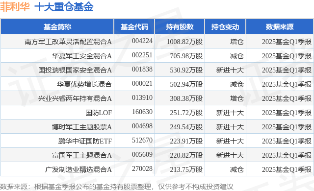 根据2025基金Q1季报公募基金重仓股数据,重仓该股的公募基金共122家,其中持有数量最多的公募基金为南方基金的南方军工改革灵活配置混合A。南方军工改革灵活配置混合A目前规模为32.06亿元,最新净值1.2371(7月14日),较上一交易日下跌0.35%,近一年上涨15.2%。该公募基金现任基金经理为邹承原。邹承原在任的基金产品包括:南方领航优选混合A,管理时间为2022年11月18日至今,期间收益率为-16.35%。