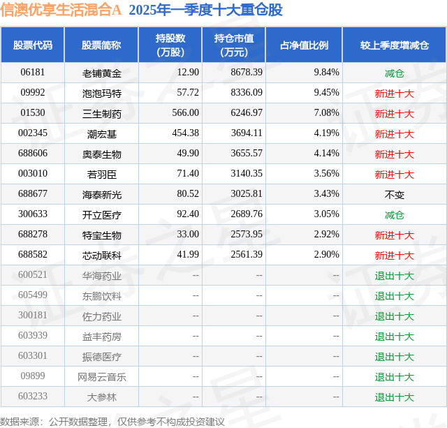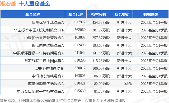 根据2025基金Q1季报公募基金重仓股数据,重仓该股的公募基金共21家,其中持有数量最多的公募基金为信达澳亚基金的信澳优享生活混合A。信澳优享生活混合A目前规模为4.36亿元,最新净值1.143(7月14日),较上一交易日上涨1.0%,近一年上涨49.76%。该公募基金现任基金经理为杨珂。杨珂在任的基金产品包括:信澳健康中国混合A,管理时间为2020年5月13日至今,期间收益率为37.61%;