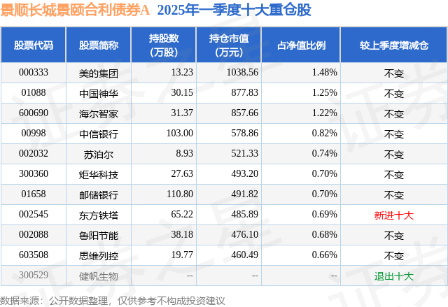 根据2025基金Q1季报公募基金重仓股数据,重仓该股的公募基金共1家,其中持有数量最多的公募基金为景顺长城基金的景顺长城景颐合利债券A。景顺长城景颐合利债券A目前规模为2.8亿元,最新净值1.0226(7月14日),较上一交易日上涨0.1%。该公募基金现任基金经理为毛从容 张靖 陈莹。毛从容在任的基金产品包括:景顺长城90天持有短债A,管理时间为2023年9月23日至今,期间收益率为5.06%;景顺长城景颐裕利债券A,管理时间为2023年11月16日至今,期间收益率为7.32%;张靖在任的基金产品包括:景顺长城策略精选灵活配置混合A,管理时间为2014年10月25日至今,期间收益率为269.59%;景顺长城中小创精选股票A,管理时间为2022年11月19日至今,期间收益率为3.55%;景顺长城中小盘混合A,管理时间为2022年11月19日至今,期间收益率为5.14%;景顺长城成长趋势股票A,管理时间为2023年7月25日至今,期间收益率为-1.5%。陈莹在任的基金产品包括:景顺长城安享回报混合A,管理时间为2020年7月25日至今,期间收益率为23.31%;景顺长城顺益回报混合A,管理时间为2020年7月25日至今,期间收益率为20.71%;景顺长城顺鑫回报混合A,管理时间为2021年9月10日至今,期间收益率为10.78%;景顺长城景颐辰利债券A,管理时间为2023年4月28日至今,期间收益率为5.59%。