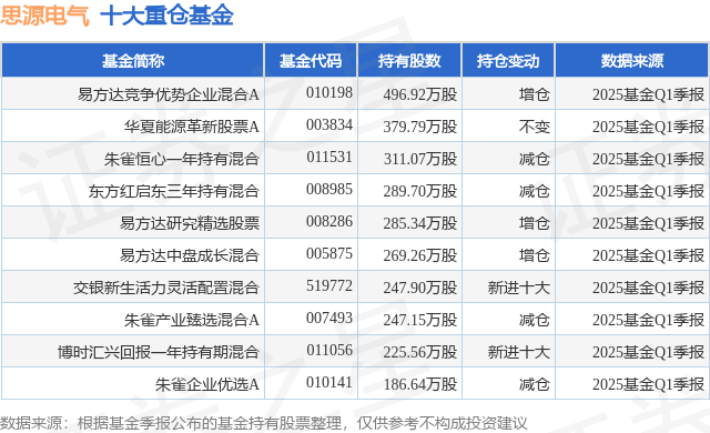 重仓思源电气的前十大公募基金请见下表: