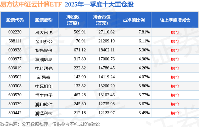 根据2025基金Q1季报公募基金重仓股数据,重仓该股的公募基金共66家,其中持有数量最多的公募基金为易方达基金的易方达中证云计算ETF。易方达中证云计算ETF目前规模为34.72亿元,最新净值1.1893(7月14日),较上一交易日下跌0.18%,近一年上涨49.33%。该公募基金现任基金经理为张湛。张湛在任的基金产品包括:易方达中证科技50ETF,管理时间为2020年3月16日至今,期间收益率为1.74%;易方达中证人工智能主题ETF,管理时间为2020年7月27日至今,期间收益率为-4.21%;易方达中证万得生物科技指数(LOF)C,管理时间为2020年12月3日至今,期间收益率为-39.72%;易方达中证生物科技主题ETF,管理时间为2021年1月14日至今,期间收益率为-50.33%。