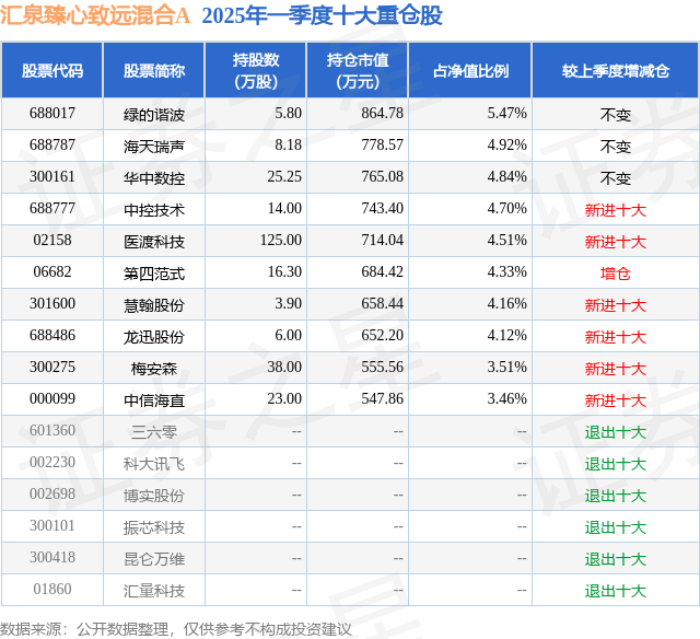 汇泉臻心致远混合A的前十大重仓股如下: