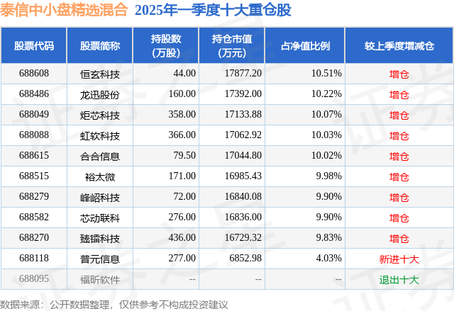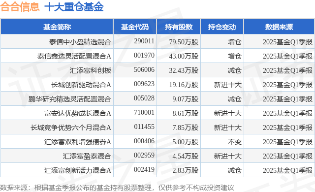 根据2025基金Q1季报公募基金重仓股数据,重仓该股的公募基金共18家,其中持有数量最多的公募基金为泰信基金的泰信中小盘精选混合。泰信中小盘精选混合目前规模为17.01亿元,最新净值3.739(7月14日),较上一交易日下跌0.35%,近一年上涨82.93%。该公募基金现任基金经理为董季周。董季周在任的基金产品包括:泰信鑫选灵活配置混合A,管理时间为2020年11月24日至今,期间收益率为-1.9%。