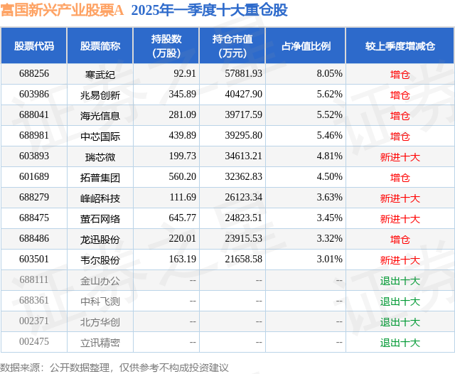 根据2025基金Q1季报公募基金重仓股数据,重仓该股的公募基金共6家,其中持有数量最多的公募基金为富国基金的富国新兴产业股票A。富国新兴产业股票A目前规模为33.12亿元,最新净值2.288(7月14日),较上一交易日上涨0.39%,近一年上涨36.11%。该公募基金现任基金经理为孙权。孙权在任的基金产品包括:富国创新企业灵活配置混合(LOF)A,管理时间为2022年7月28日至今,期间收益率为5.41%。