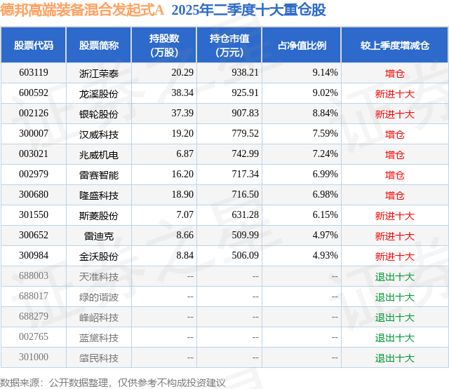 德邦高端装备混合发起式A的前十大重仓股如下: